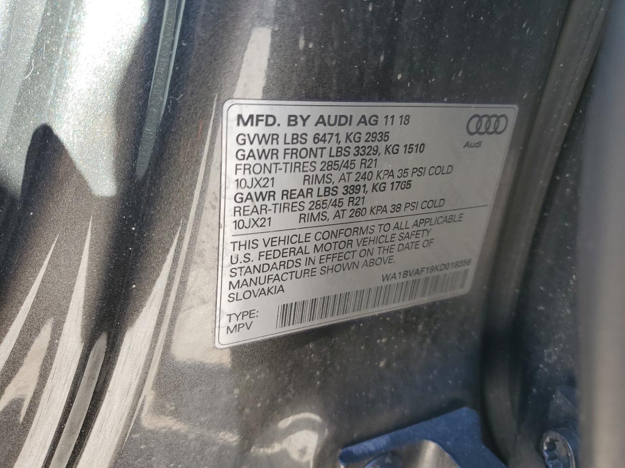 Колір СірийЦиліндри 6Привід Повний привідVIN WA1BVAF19KD018356Стан Заводиться та їде (перевірено)Ушкодження НезначніДата аукціону 2025-07-03