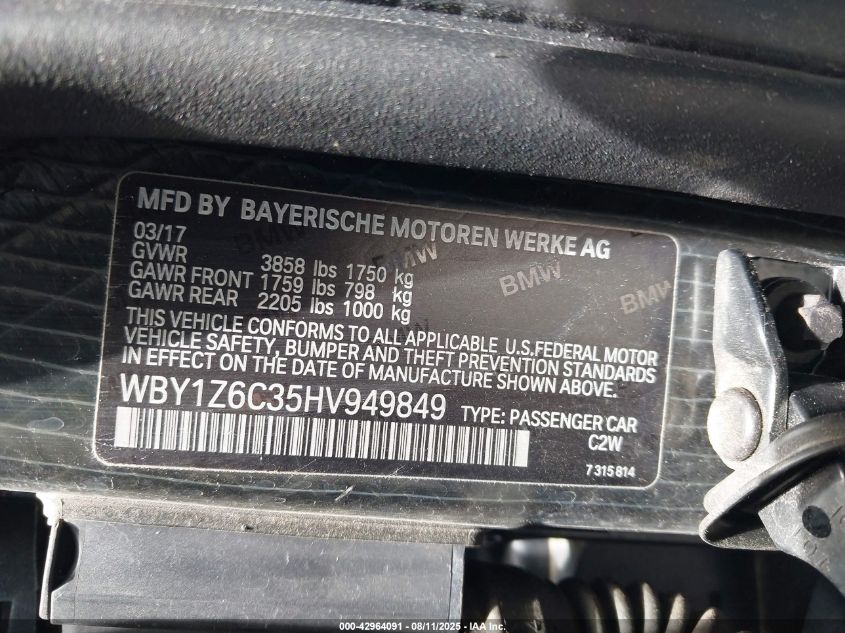 Колір ЧорнийПривід Задній привідVIN WBY1Z6C35HV******Стан НевідомоУшкодження Передня і задня Дата аукціону 2025-09-25