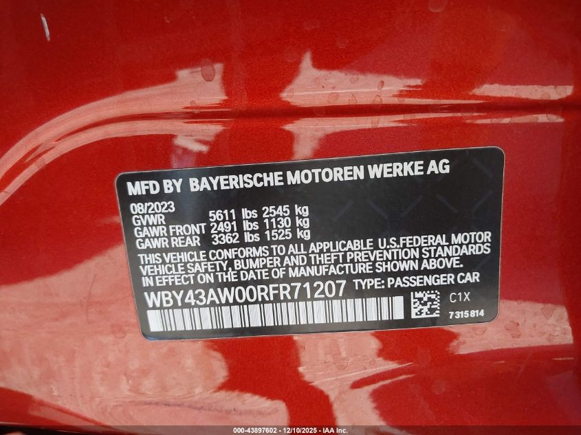 Колір АпельсиновийПривід Задній привідVIN WBY43AW00RFR71207Стан Заводиться та їде (перевірено)Ушкодження Ліва сторонаДата аукціону 2025-12-18 AutoRIA