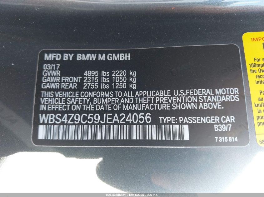 2018 BMW M4 2018 року Бензин, 3.0, Задній привід, vin - WBS4Z9C59JEA24056 з США