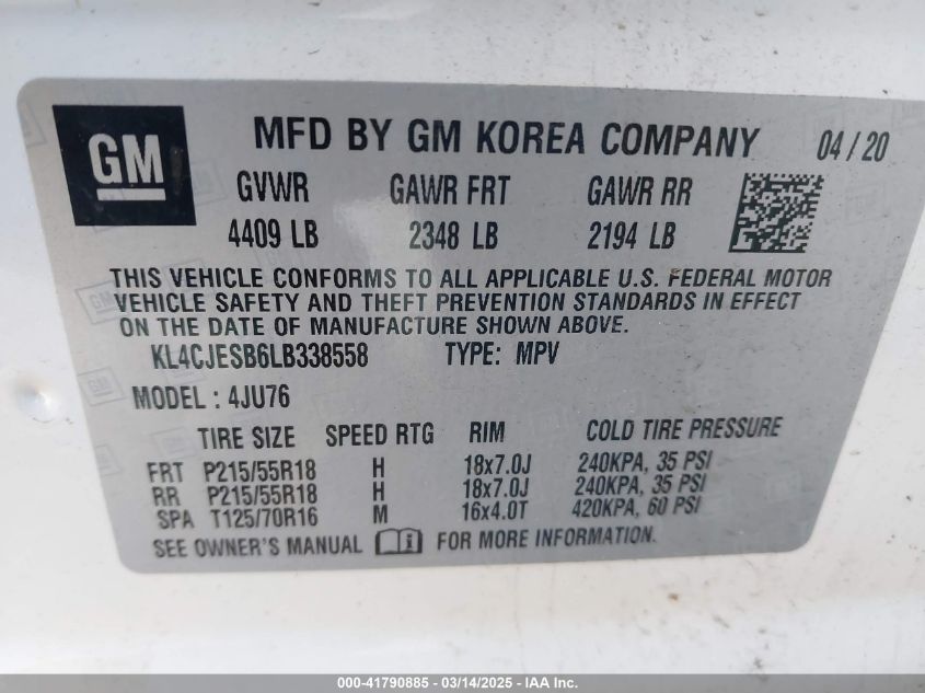Колір БілийЦиліндри 4Привід Повний привідVIN KL4CJESB6LB338558Стан СтаціонарноУшкодження Передня або задняДата аукціону 2025-11-20