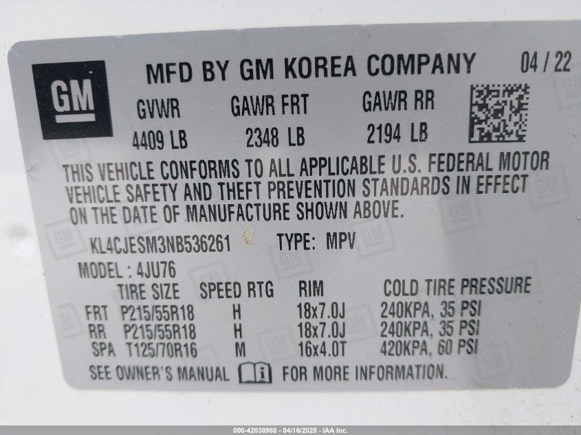 Колір БілийЦиліндри 4Привід Повний привідVIN KL4CJESM3NB******Стан НевідомоУшкодження Передня або задняДата аукціону 2025-09-02