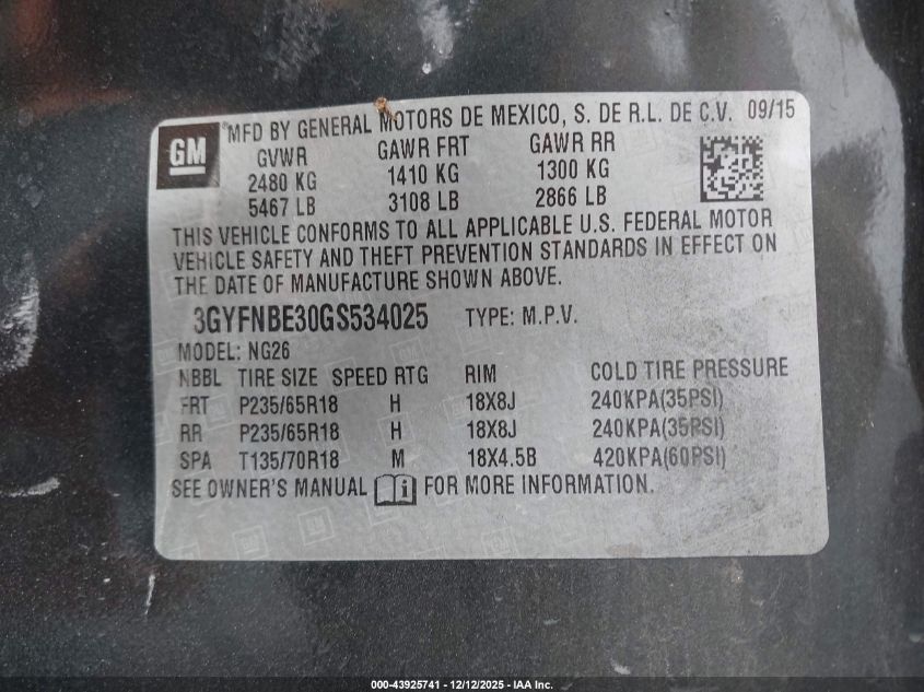 Колір ЧорнийЦиліндри 6Привід Передній привідVIN 3GYFNBE30GS534025Стан Заводиться та їде (перевірено)Ушкодження Ліва сторонаДата аукціону 2025-12-16