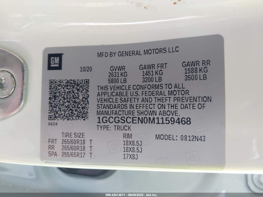 Колір БілийЦиліндри 6Привід НевідомоVIN 1GCGSCEN0M1******Стан НевідомоУшкодження Задня ліваДата аукціону 2025-08-13