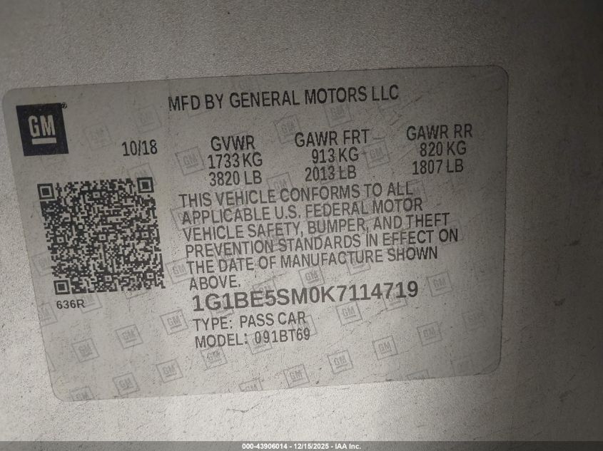 Колір СрібнийЦиліндри 4Привід Передній привідVIN 1G1BE5SM0K7114719Стан Заводиться та їде (перевірено)Ушкодження Передня або задня AutoRIA