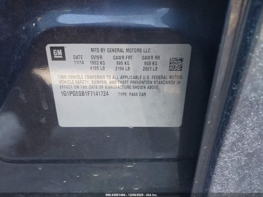 2015 CHEVROLET CRUZE 2015 року Бензин, 1.4, Передній привід, vin - 1G1PG5SB1F7141724 з США