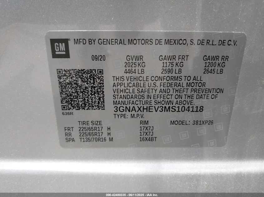 2021 CHEVROLET EQUINOX 2021 року Бензин, 1.5, Передній привід, vin - 3GNAXHEV3MS104118 з США