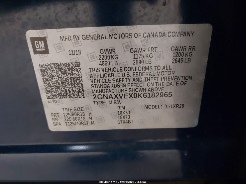 2019 CHEVROLET EQUINOX 2019 року Бензин, 2.0, Повний привід, vin - 2GNAXVEX0K6182965 з США