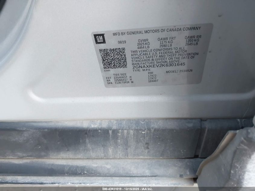 2019 CHEVROLET EQUINOX 2019 року Бензин, 1.5, Передній привід, vin - 2GNAXKEV2K6301645 з США