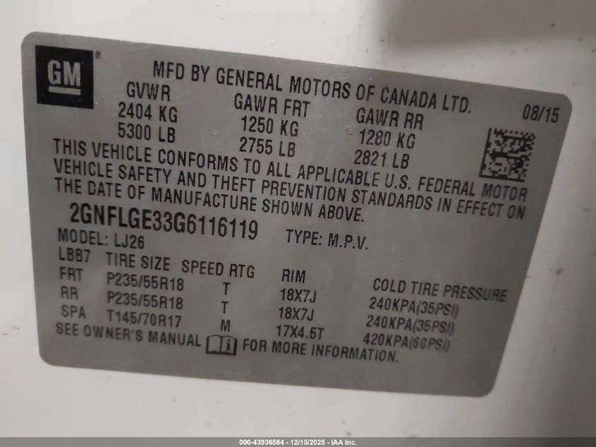 2016 CHEVROLET EQUINOX 2016 року Бензин, 3.6, Повний привід, vin - 2GNFLGE33G6116119 з США
