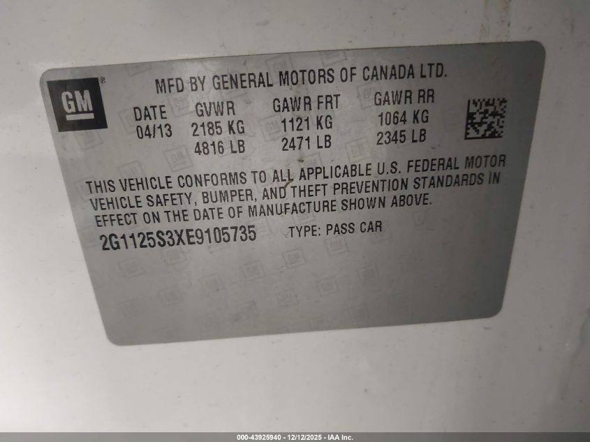 2014 CHEVROLET IMPALA 2014 року Бензин, 3.6, Передній привід, vin - 2G1125S3XE9105735 з США
