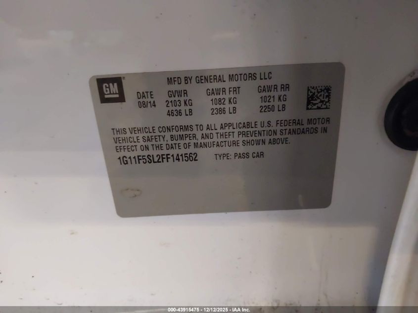 2015 CHEVROLET MALIBU 2015 року Бензин, 2.5, Передній привід, vin - 1G11F5SL2FF141562 з США