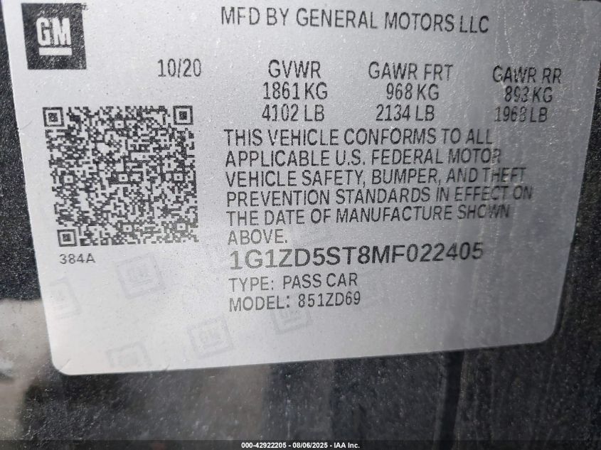 2021 CHEVROLET MALIBU 2021 року Бензин, 1.5, Передній привід, vin - 1G1ZD5ST8MF022405 з США