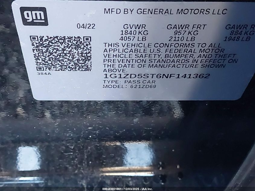 2022 CHEVROLET MALIBU 2022 року Бензин, 1.5, Передній привід, vin - 1G1ZD5ST6NF141362 з США