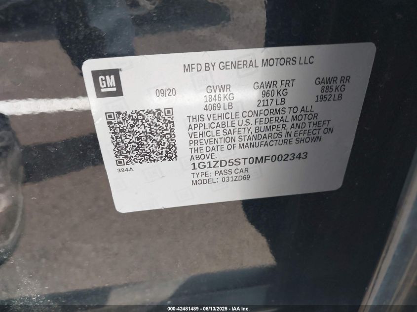 2021 CHEVROLET MALIBU 2021 року Бензин, 1.5, Передній привід, vin - 1G1ZD5ST0MF002343 з США