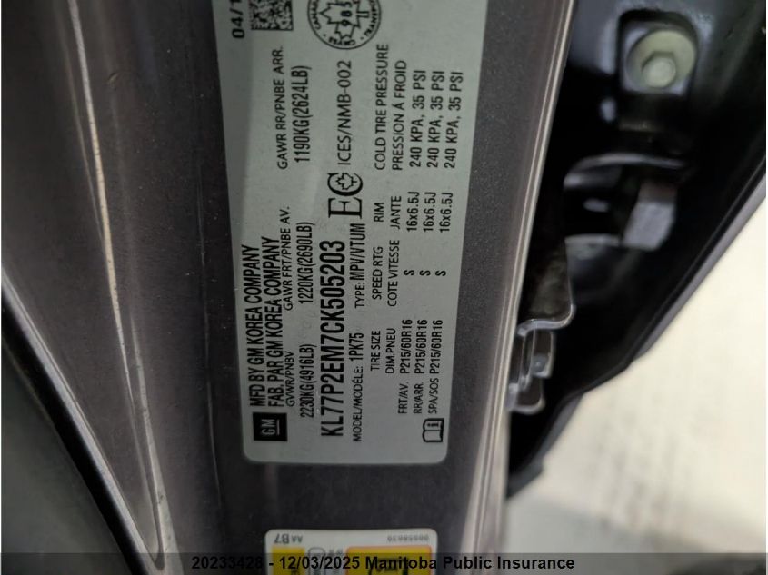 Колір СірийЦиліндри 4Привід Передній привідVIN KL77P2EM7CK505203Стан СтаціонарноУшкодження НевідомоДата аукціону 2025-12-10 AutoRIA