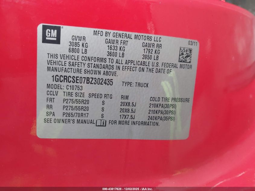 Колір ЧервонийЦиліндри 8VIN 1GCRCSE07BZ302435Стан СтаціонарноУшкодження Передня і задня