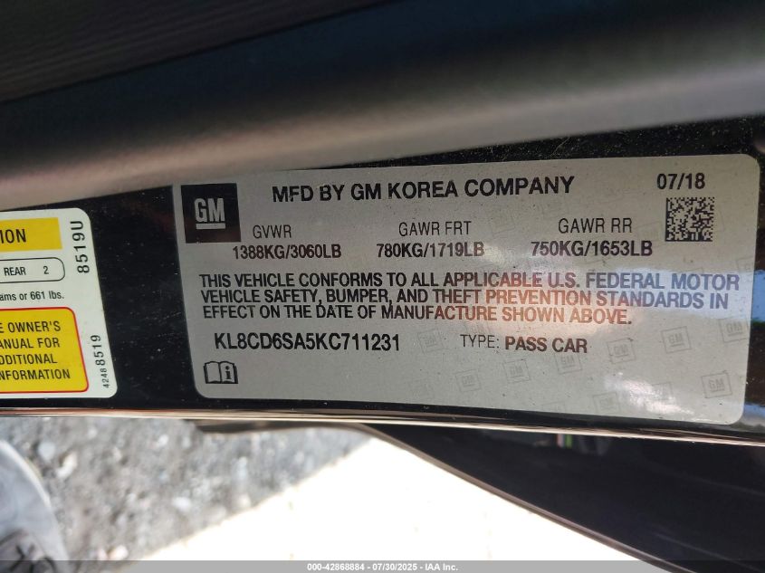 2019 CHEVROLET SPARK 2019 року Бензин, 1.4, Передній привід, vin - KL8CD6SA5KC****** з США