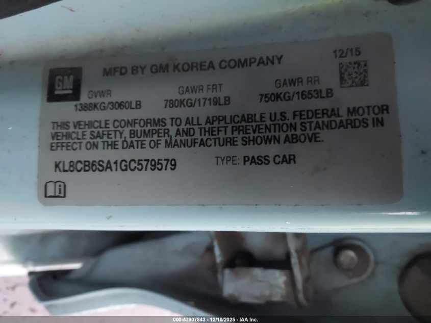 2016 CHEVROLET SPARK 2016 року Бензин, 1.4, Передній привід, vin - KL8CB6SA1GC579579 з США