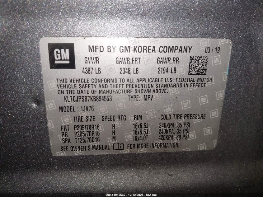 2019 CHEVROLET TRAX 2019 року Бензин, 1.4, Повний привід, vin - KL7CJPSB7KB894553 з США