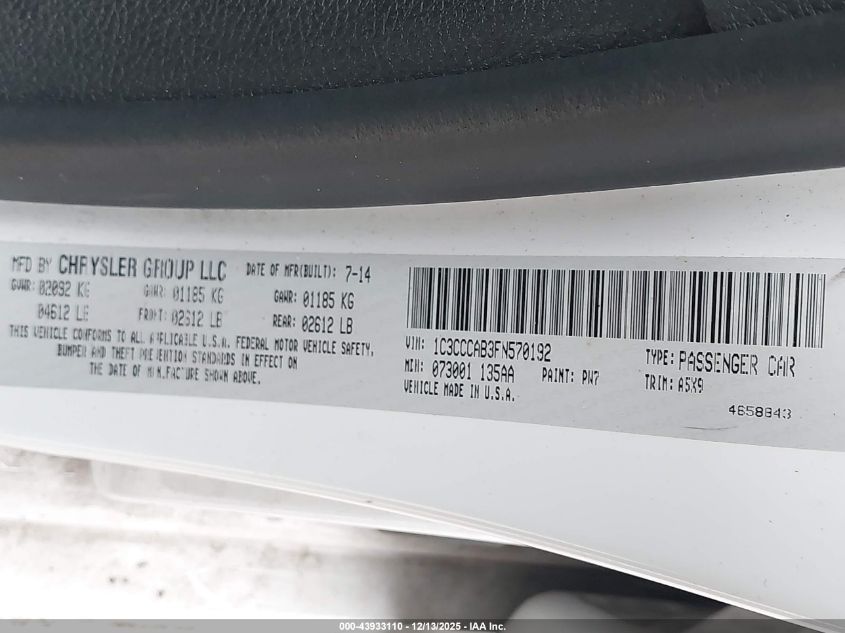 2015 CHRYSLER 200 2015 року Бензин, 2.4, Передній привід, vin - 1C3CCCAB3FN570192 з США