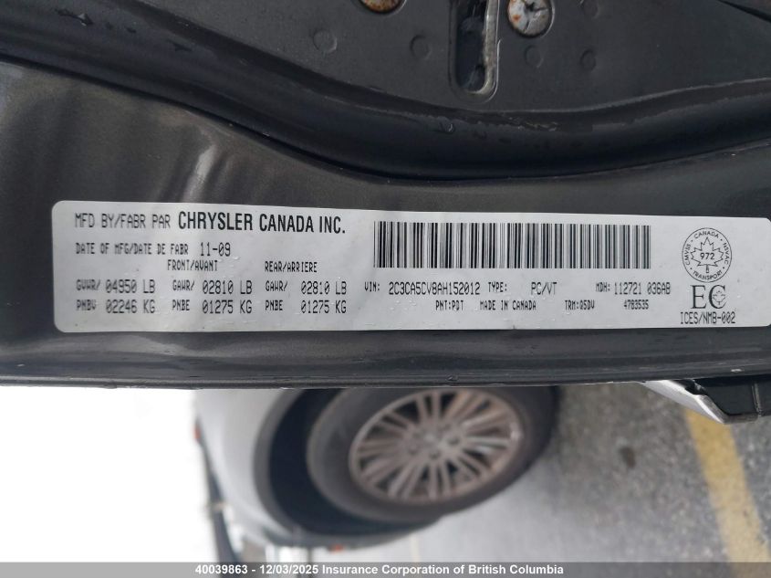 Колір СірийЦиліндри 6Привід Задній привідVIN 2C3CA5CV8AH152012Стан Заводиться та їде (перевірено)Ушкодження Задня праваДата аукціону 2025-12-05 AutoRIA