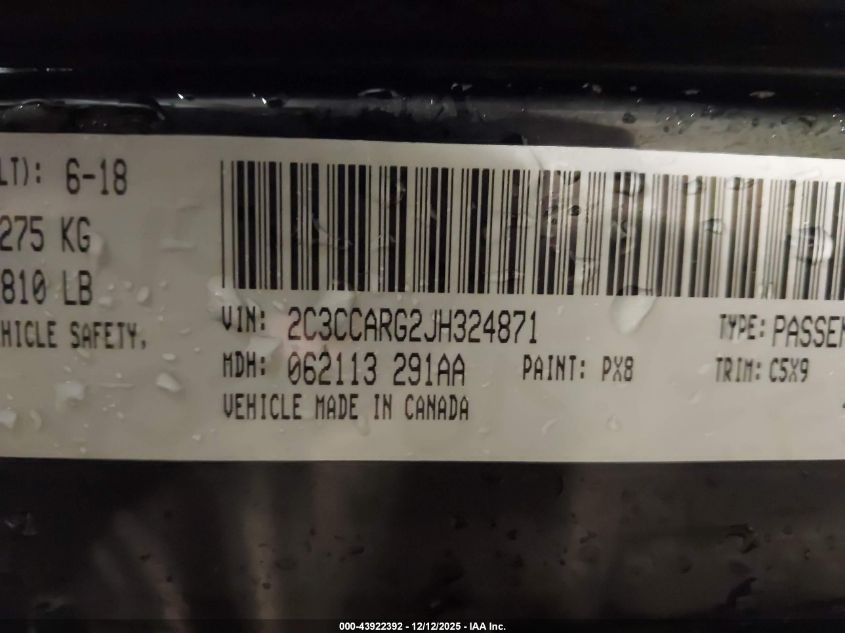 Колір ЧорнийЦиліндри 6Привід Повний привідVIN 2C3CCARG2JH324871Стан Заводиться та їде (перевірено)Ушкодження Передня або задня AutoRIA