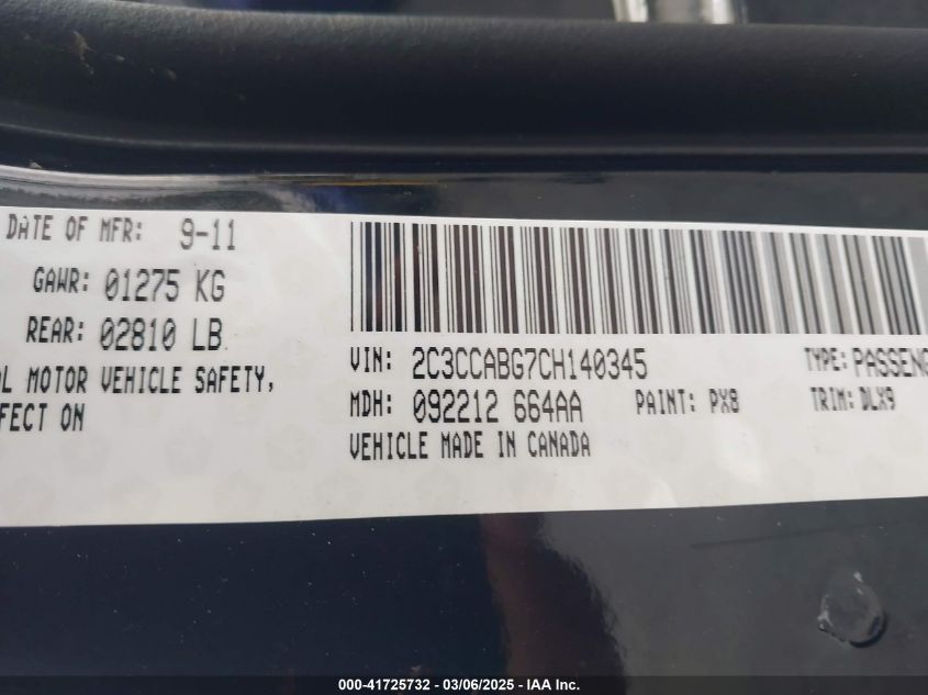 Колір ЧорнийЦиліндри 6Привід Задній привідVIN 2C3CCABG7CH******Стан НевідомоУшкодження Передня права