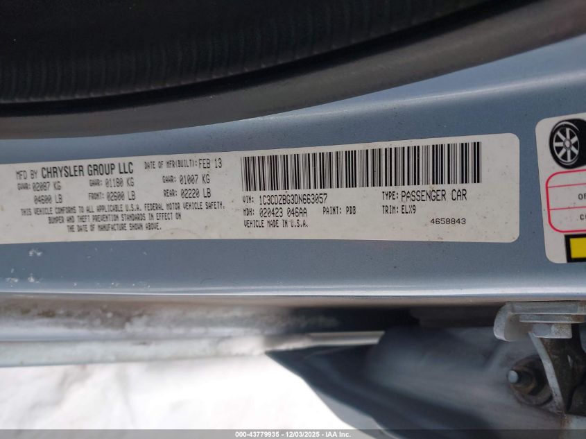 Колір СинійЦиліндри 6Привід Передній привідVIN 1C3CDZBG3DN663057Стан СтаціонарноУшкодження Передня або задня AutoRIA