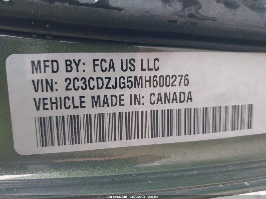 Колір ЗеленийЦиліндри 6Привід Задній привідVIN 2C3CDZJG5MH600276Стан Заводиться та їде (перевірено)Ушкодження Передня праваДата аукціону 2025-10-15