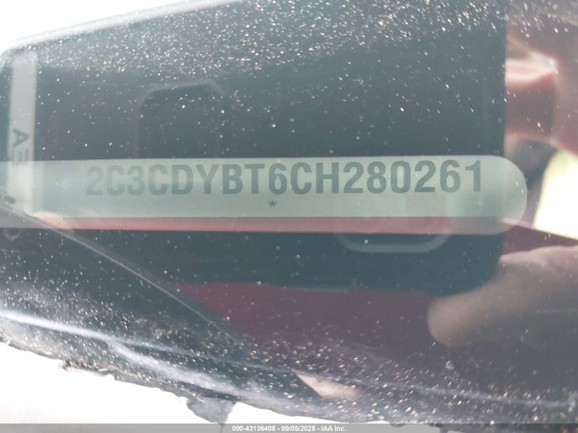 Колір ЧервонийЦиліндри 8Привід Задній привідVIN 2C3CDYBT6CH280261Стан СтаціонарноУшкодження ГрадДата аукціону 2025-11-04