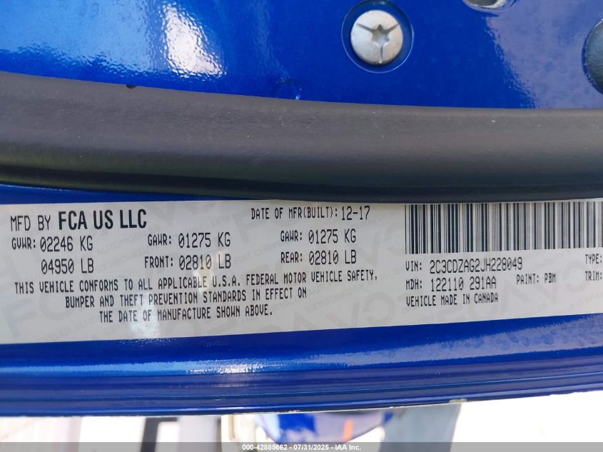 Колір СинійЦиліндри 6Привід Задній привідVIN 2C3CDZAG2JH******Стан НевідомоУшкодження Передня праваДата аукціону 2025-09-10