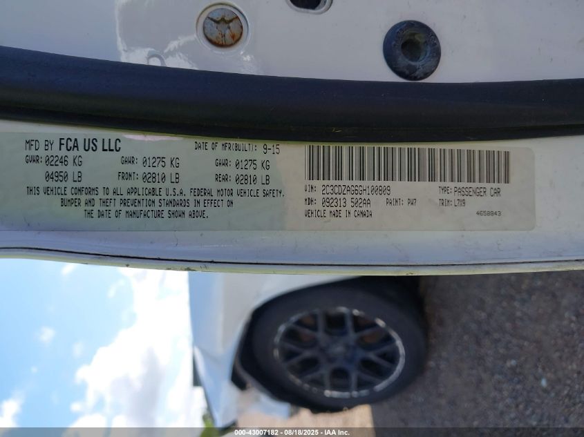 Колір БілийЦиліндри 6Привід Задній привідVIN 2C3CDZAG6GH******Стан НевідомоУшкодження Передня або задняДата аукціону 2025-09-30