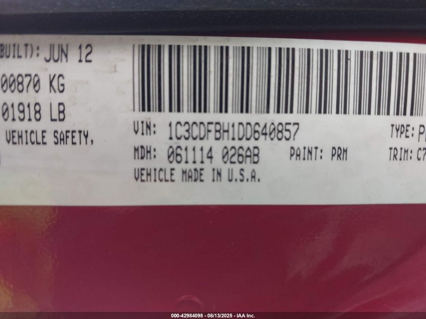 Колір ЧервонийЦиліндри 4Привід Передній привідVIN 1C3CDFBH1DD******Стан НевідомоУшкодження Передня ліваДата аукціону 2025-09-19