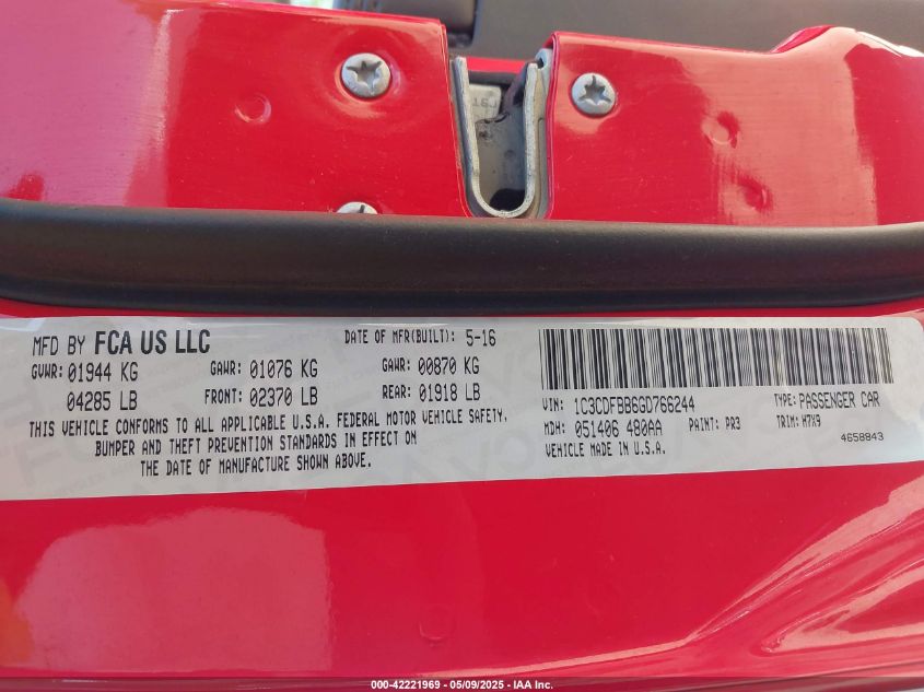 2016 DODGE DART 2016 року Бензин, 2.4, Передній привід, vin - 1C3CDFBB6GD****** з США