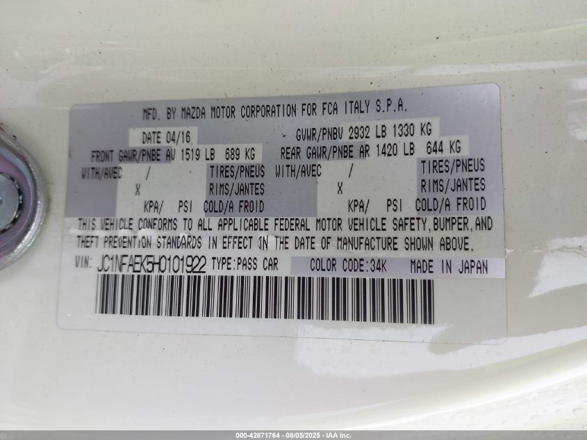 2017 FIAT 124 SPIDER 2017 року Бензин, 1.4, Задній привід, vin - JC1NFAEK5H0****** з США