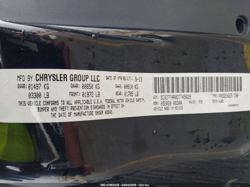 Колір ЧорнийЦиліндри 4Привід Передній привідVIN 3C3CFFAR0DT******Стан НевідомоУшкодження Передня або задняДата аукціону 2025-06-26