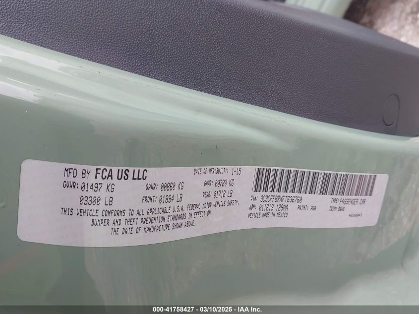 2015 FIAT 500 2015 року Бензин, 1.4, Передній привід, vin - 3C3CFFBRXFT****** з США