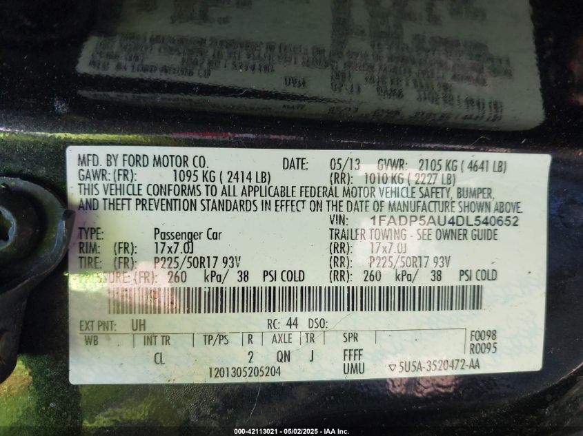Колір ЧорнийЦиліндри 4Привід Передній привідVIN 1FADP5AU4DL540652Стан Заводиться та їде (перевірено)Ушкодження ЗадняДата аукціону 2025-10-28