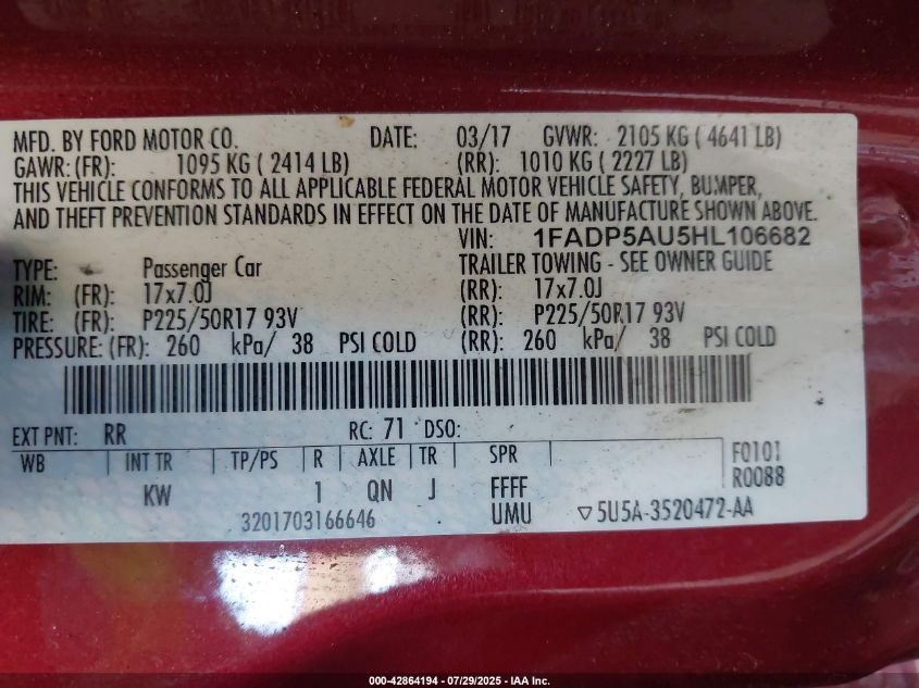 Колір ЧервонийЦиліндри 4Привід Передній привідVIN 1FADP5AU5HL******Стан НевідомоУшкодження НезначніДата аукціону 2025-09-23
