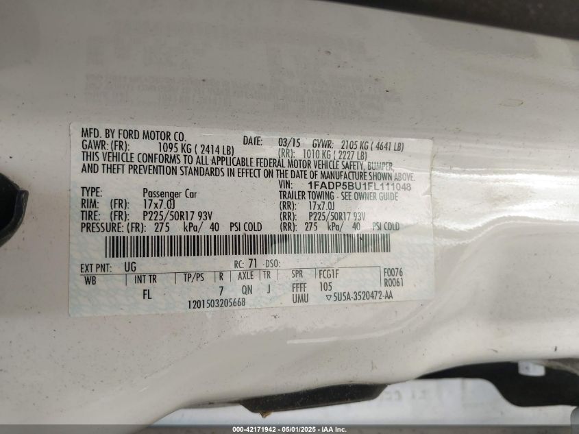Колір БілийЦиліндри 4Привід Передній привідVIN 1FADP5BU1FL******Стан НевідомоУшкодження Передня праваДата аукціону 2025-06-19