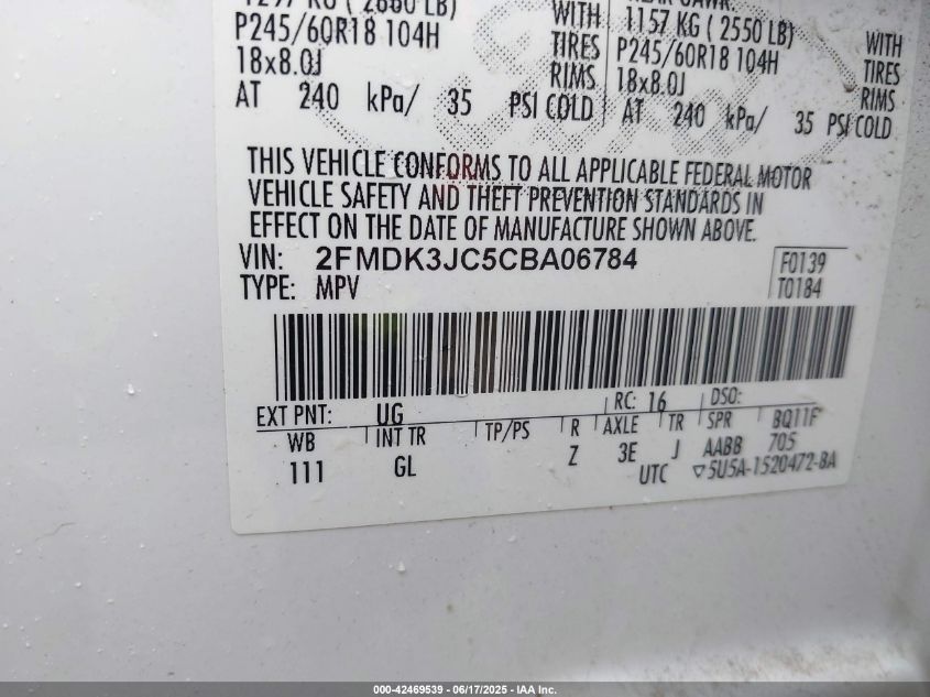 Колір БілийЦиліндри 6Привід Передній привідVIN 2FMDK3JC5CB******Стан НевідомоУшкодження З боківДата аукціону 2025-09-18