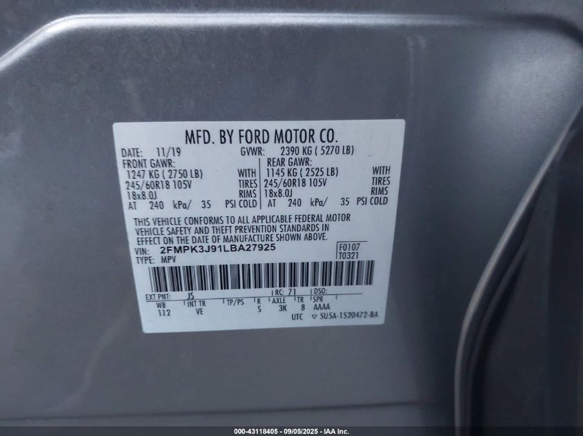 2020 FORD EDGE 2020 року Бензин, 2.0, Передній привід, vin - 2FMPK3J91LB****** з США