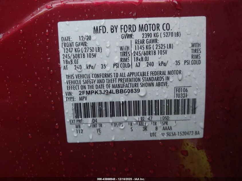 2020 FORD EDGE 2020 року Бензин, 2.0, Передній привід, vin - 2FMPK3J94LBB60839 з США