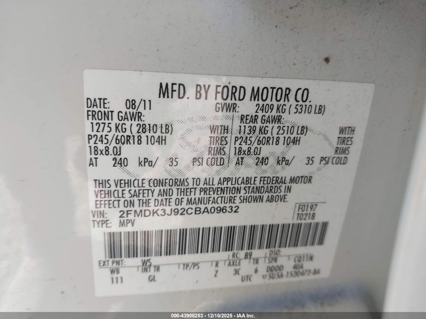 Колір БілийЦиліндри 4Привід Передній привідVIN 2FMDK3J92CBA09632Стан СтаціонарноУшкодження Передня або задня AutoRIA