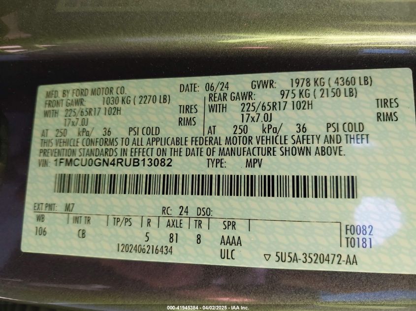 2024 FORD ESCAPE 2024 року Бензин, 1.5, Передній привід, vin - 1FMCU0GN4RUB13082 з США