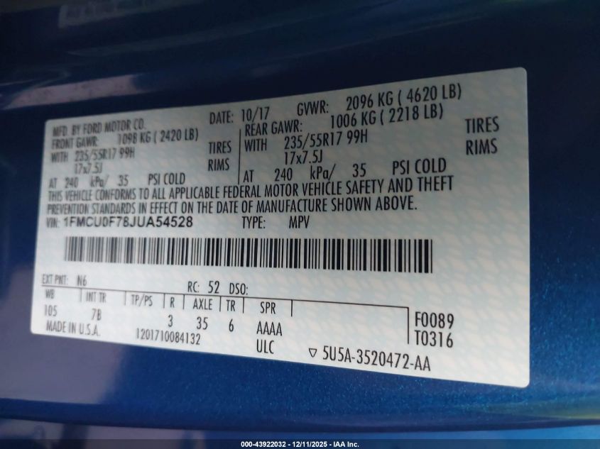 Колір СинійЦиліндри 4Привід Передній привідVIN 1FMCU0F78JUA54528Стан Заводиться та їде (перевірено)Ушкодження Передня або задня AutoRIA