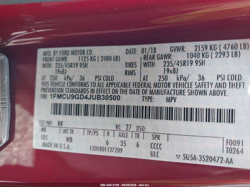 Колір ЧервонийЦиліндри 4Привід Повний привідVIN 1FMCU9GD4JU******Стан НевідомоУшкодження Ліва сторонаДата аукціону 2025-10-01