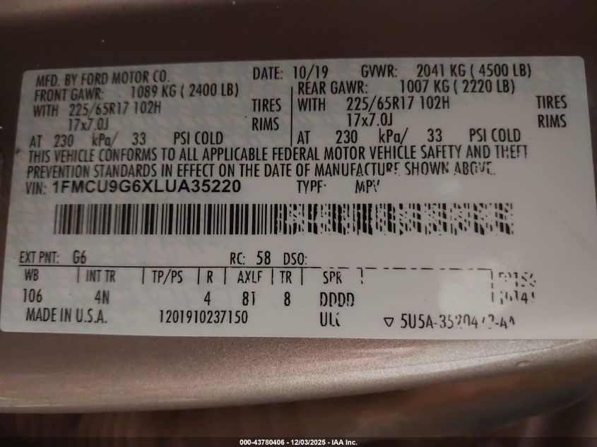 2020 FORD ESCAPE 2020 року Бензин, 1.5, Повний привід, vin - 1FMCU9G6XLUA35220 з США