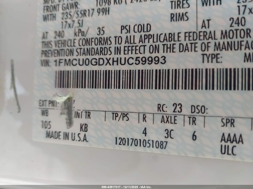 Колір БілийЦиліндри 4Привід Передній привідVIN 1FMCU0GDXHUC59993Стан Заводиться та їде (перевірено)Ушкодження Передня або задня AutoRIA